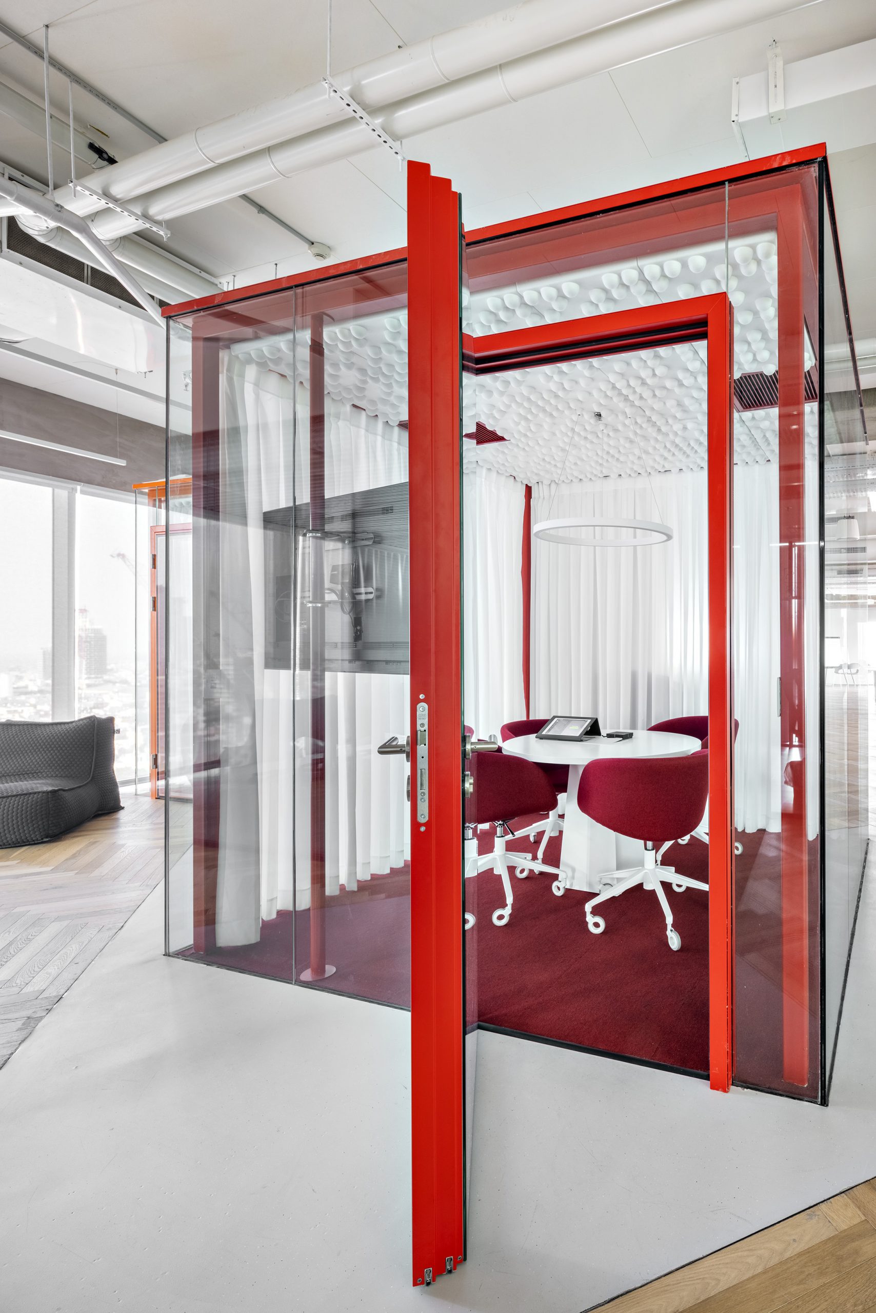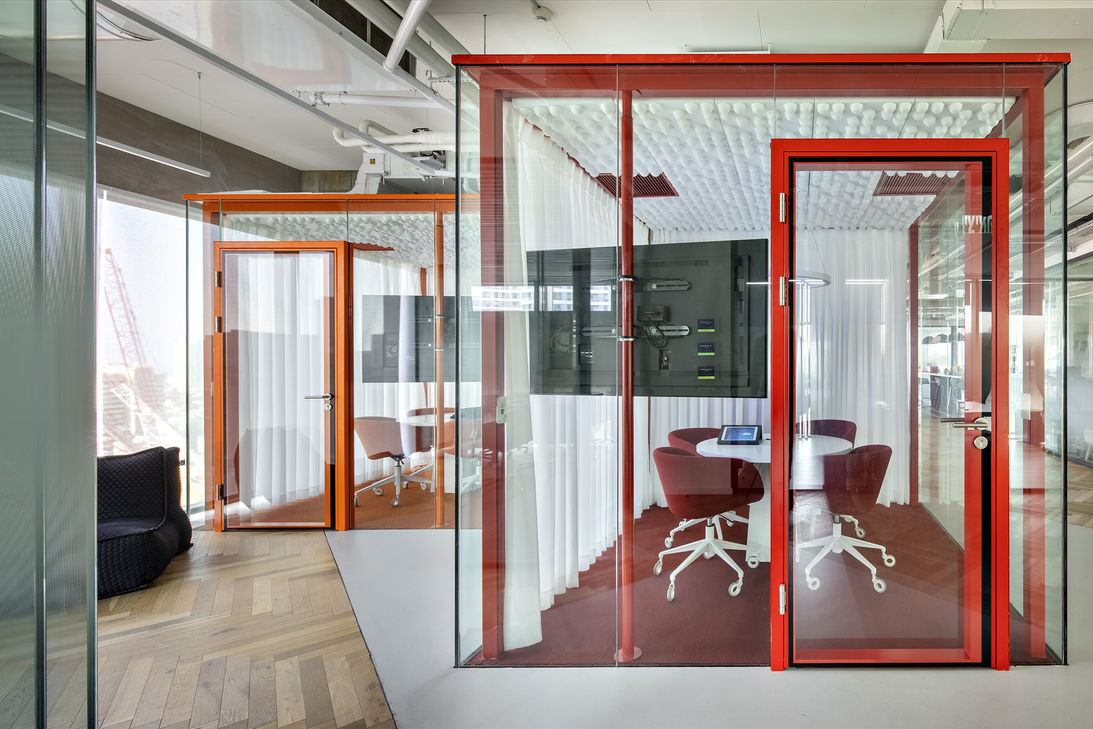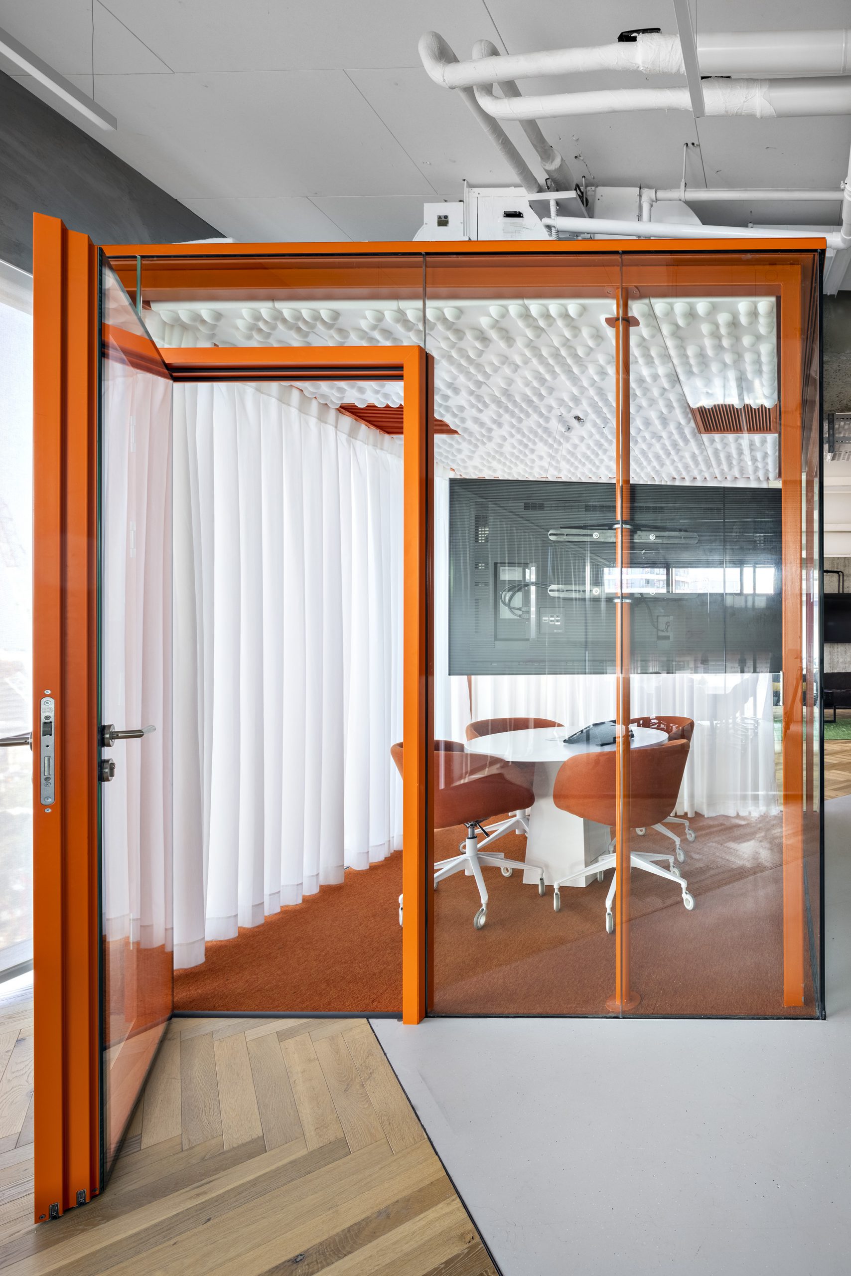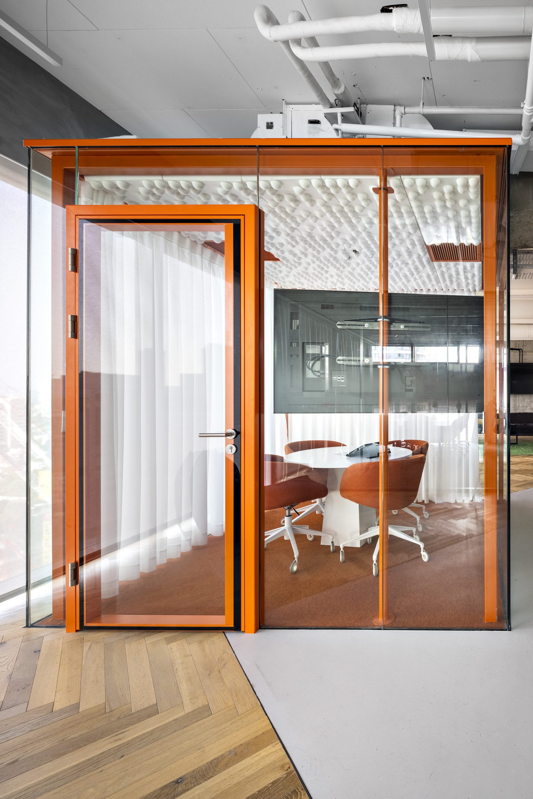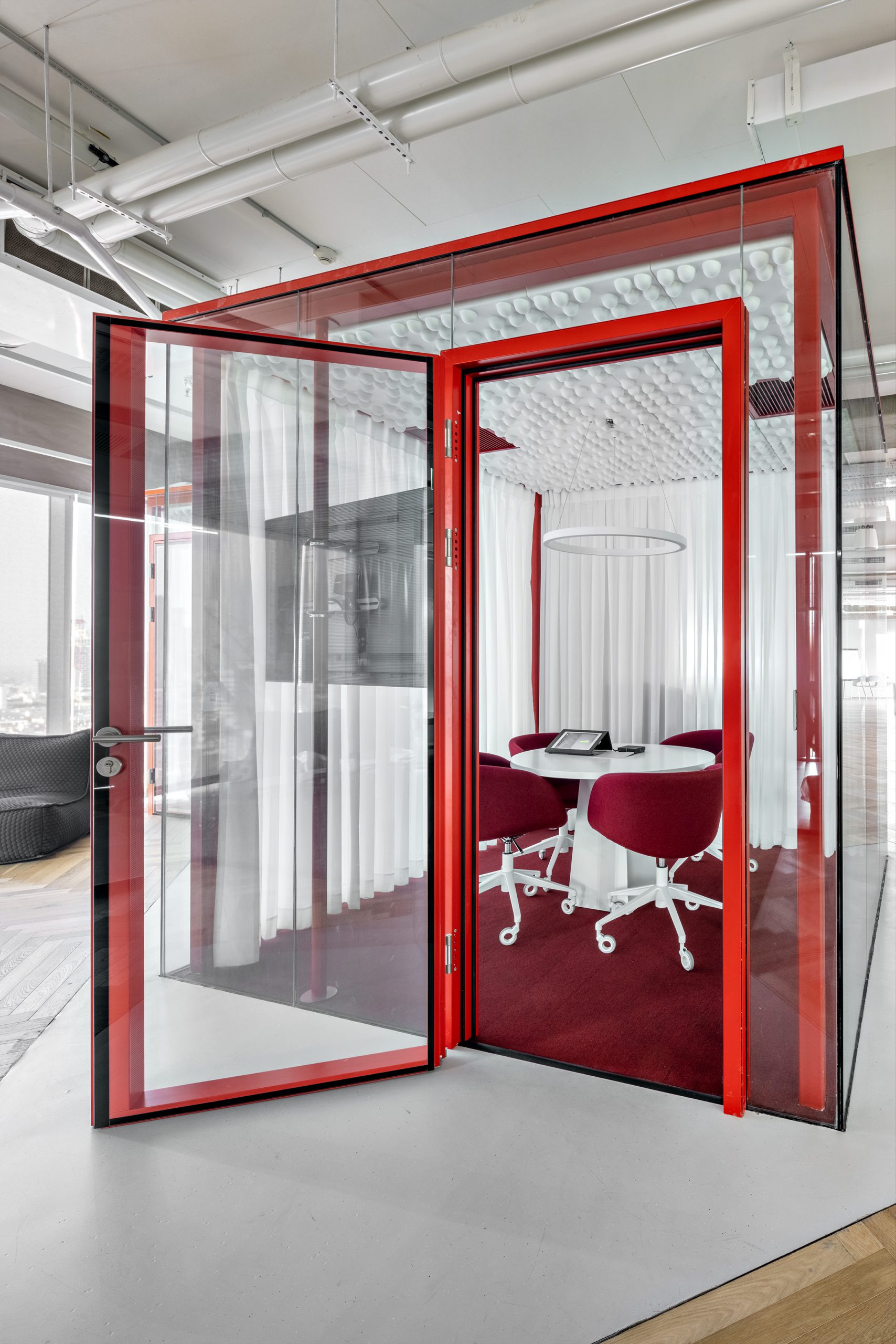 对于这个空间,需要声学隐私。 声学性能与美观和独特的设计同样重要。 我们的双层玻璃墙系统 Panorama 达到了 51 db/SCT 值,确保了最佳声学效果。