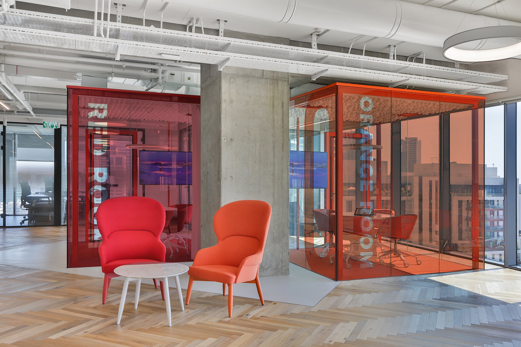 Maars Living Walls 在这个办公室设计中创造了一个独特的地标。 两种透明的彩色玻璃房间解决方案被设计为入口空间的一个组成部分。 直接进入办公室,建筑师选择了一个丰富多彩的设计声明。